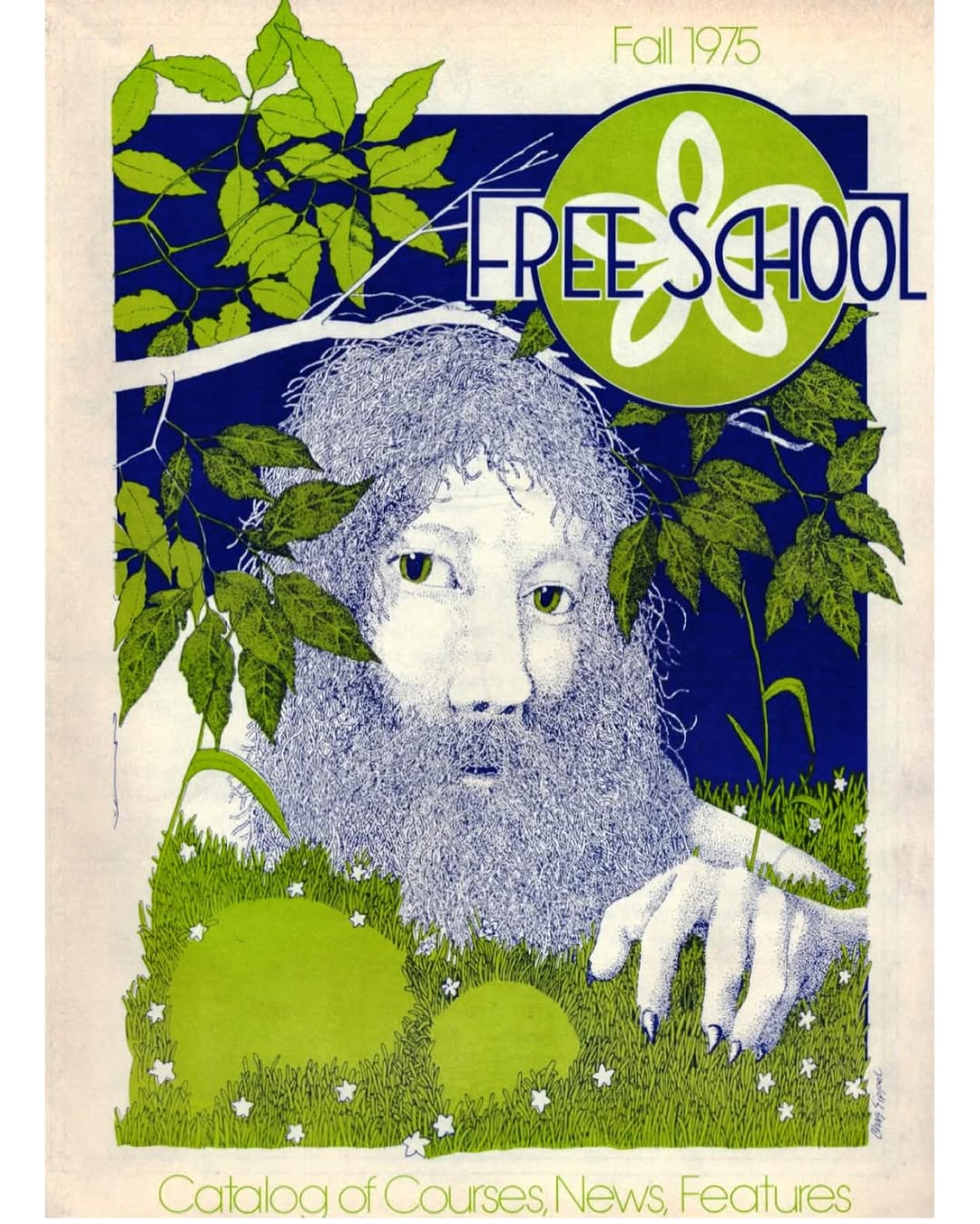 Cover for the Fall 1975 Boulder Free School catalog by Chas Sippel (actually a self-portrait). The Free School was a successful education experiment in the ‘70s wherein anyone could teach a class on whatever topic they wanted. If students signed up for your class you were good to go. (I’m looking for all the ‘70s catalogs if you have them.)